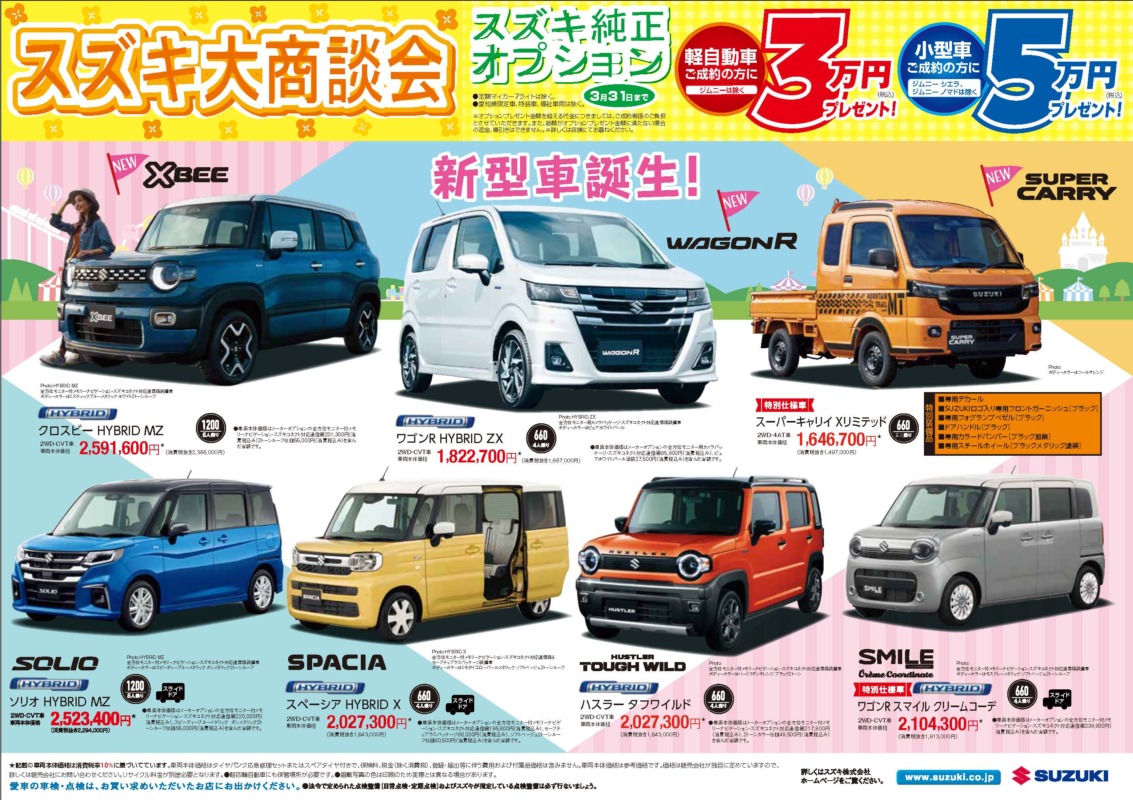 - ご成約頂いた方へのスズキ純正オプション3万円プレゼントは、2026年3月31日(火)までとなります。